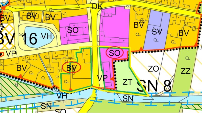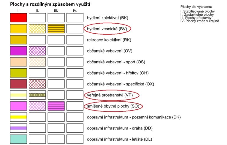 • územní plán: kombinace „bydlení vesnické“ + „smíšené obytné plochy“ a „trvalé travní porosty“