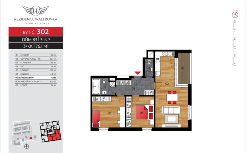 Byt má podlahovou plochu 81 m² (užitná plocha 76,1 m²) a lodžii o velikosti 5,6 m². Dispozice je prakticky řešená a nabízí dostatek prostoru pro rodinný život i práci z domova.